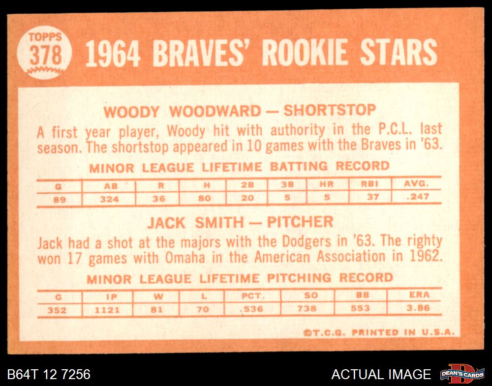 1964 Topps #378 - Woody Woodward / Jack Smith Braves Rookies 5 - EX