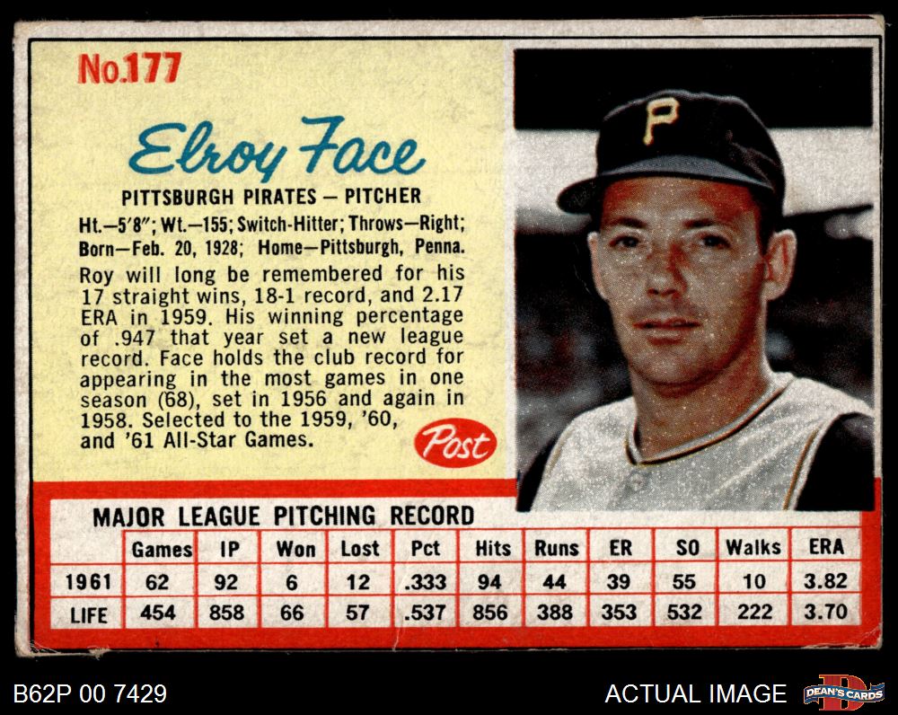 1962 Post Cereal #177 Roy Face 2 - GOOD