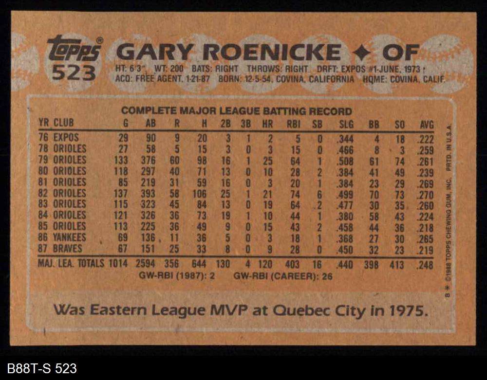 1988 Topps #523 Gary Roenicke 8 - NM/MT