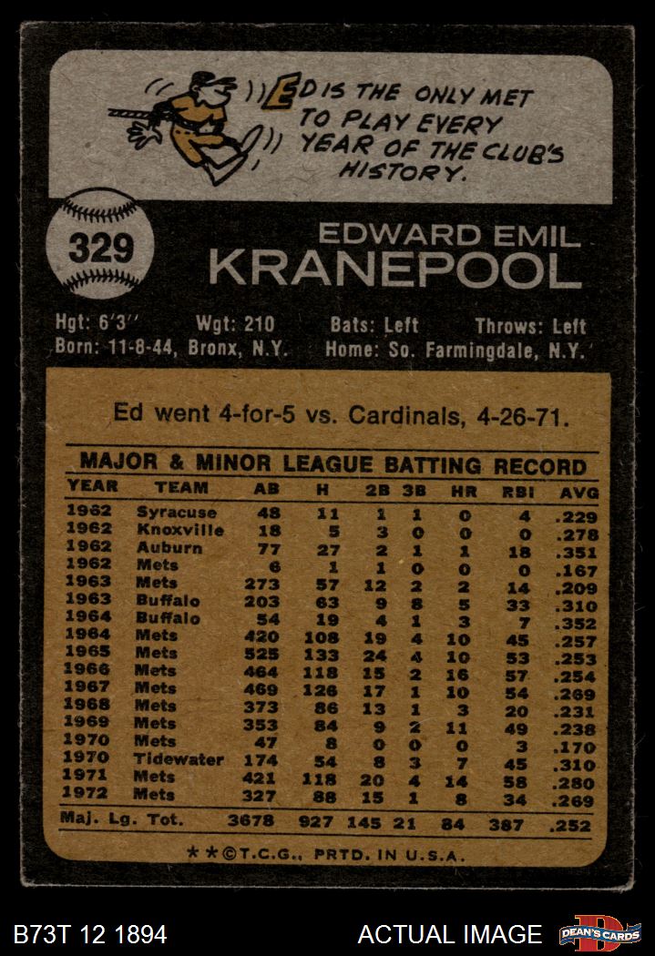 1973 Topps #329 Ed Kranepool Front Thumbnail
