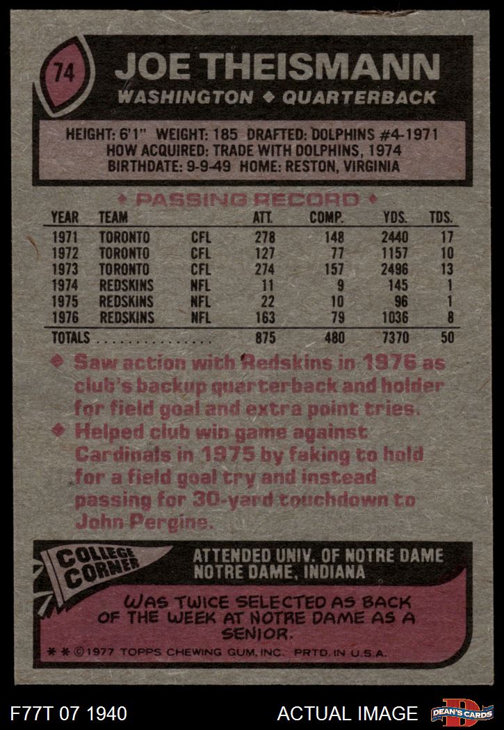 1977 Topps #74 Joe Theismann