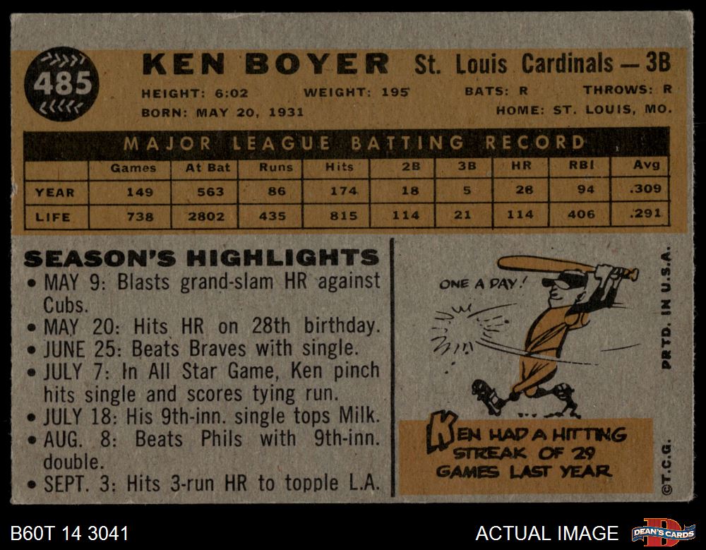 1960 Topps #485 Ken Boyer 4 - VG/EX