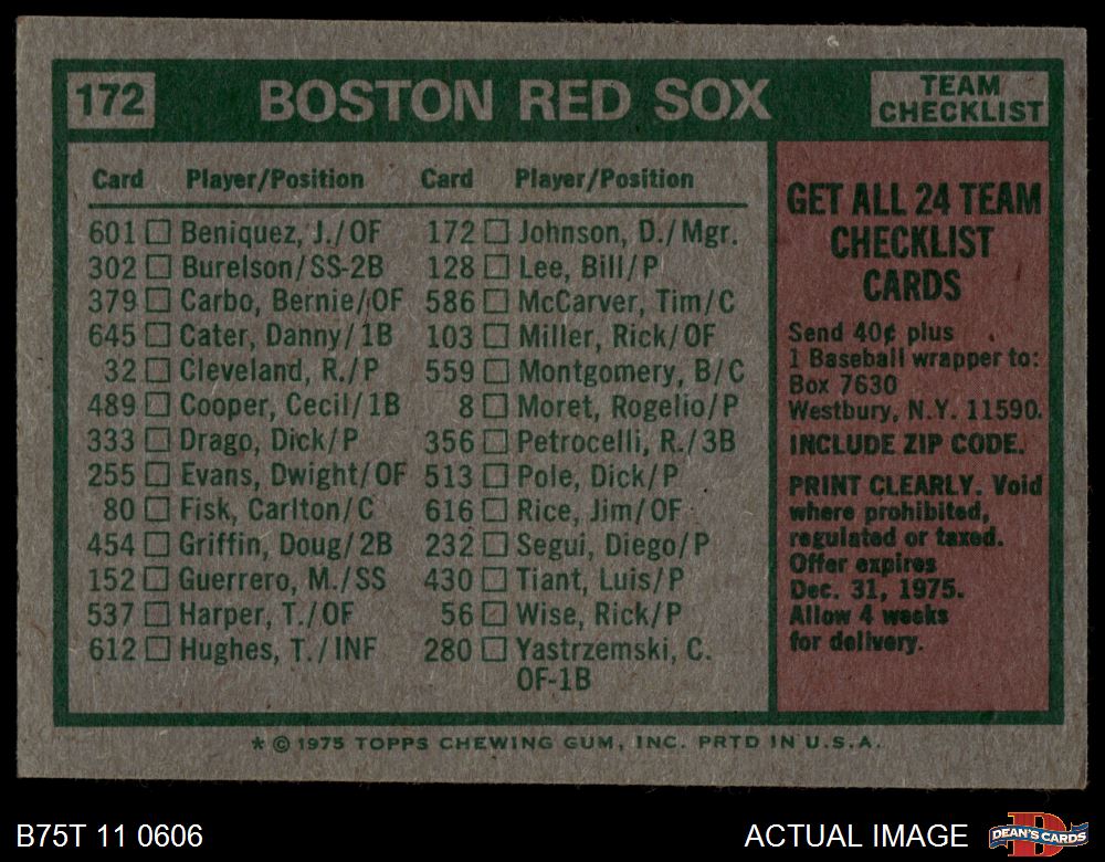 1975 Topps #172 - Darrell Johnson Red Sox Team Checklist 4 - VG/EX