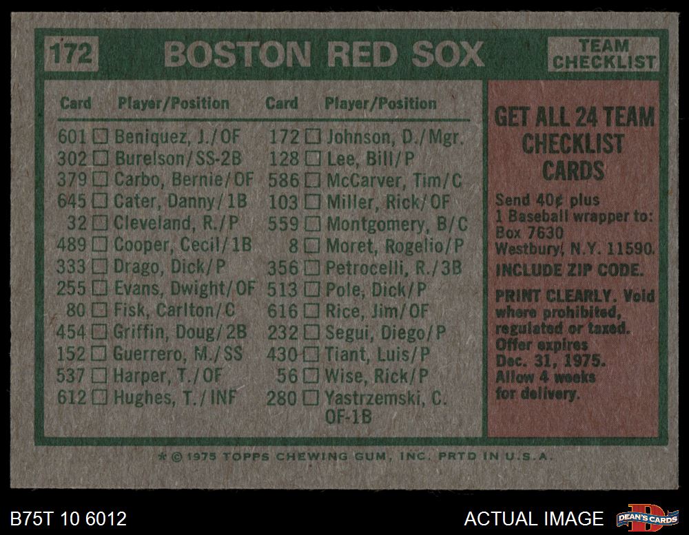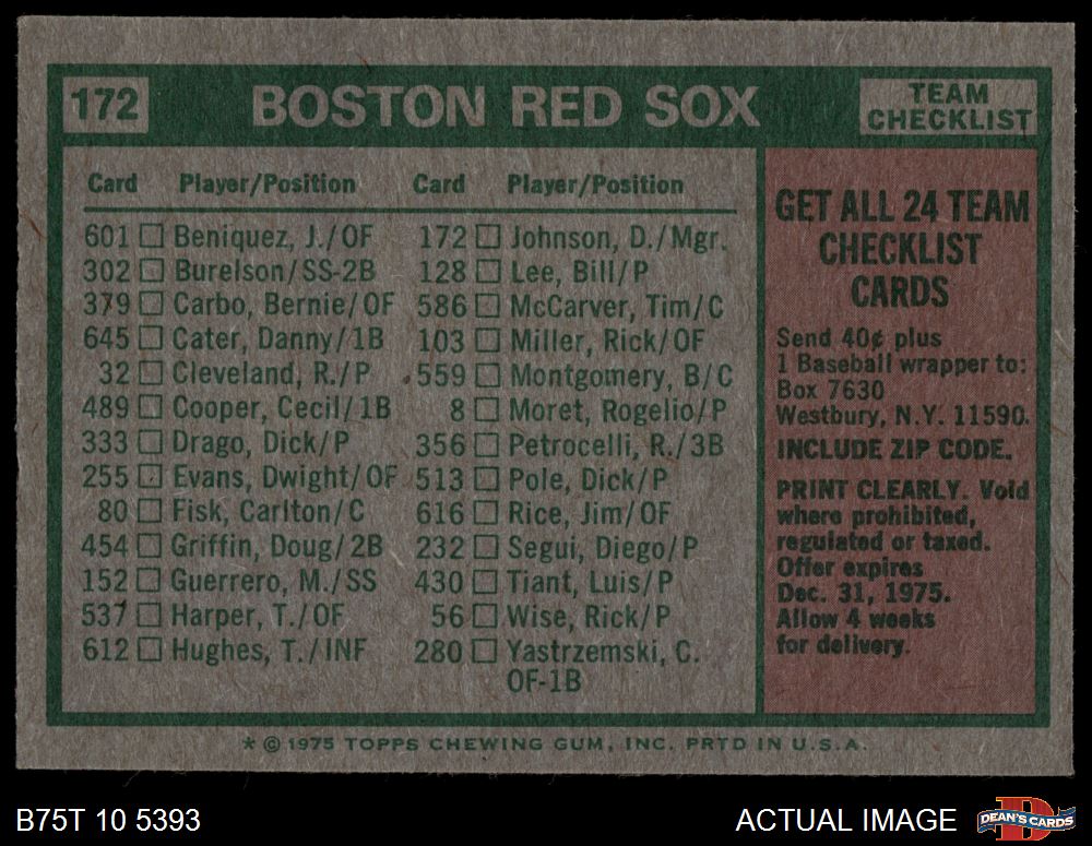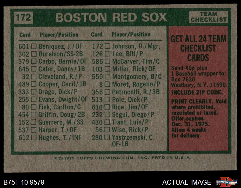 1975 Topps #172 - Darrell Johnson Red Sox Team Checklist 5 - EX
