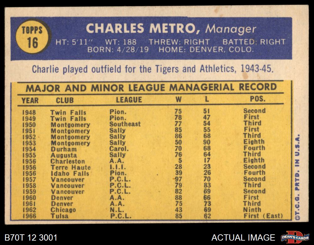1970 Topps #16 Charlie Metro 5 - EX