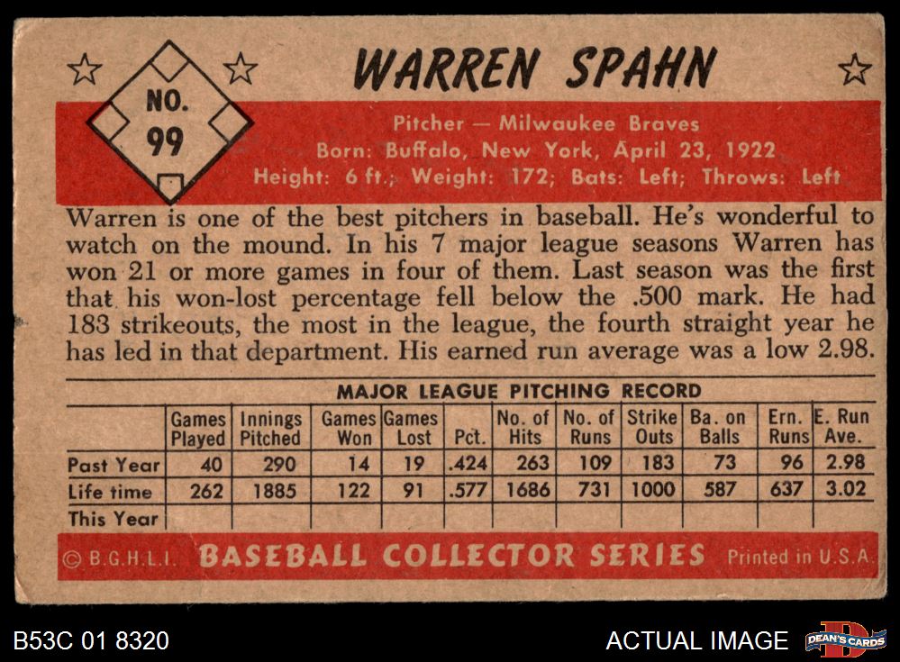 1953 Bowman #99 Warren Spahn 1.5 - FAIR