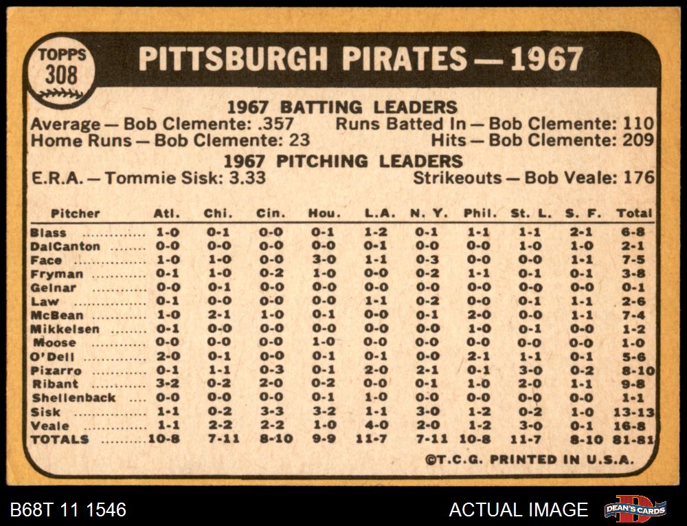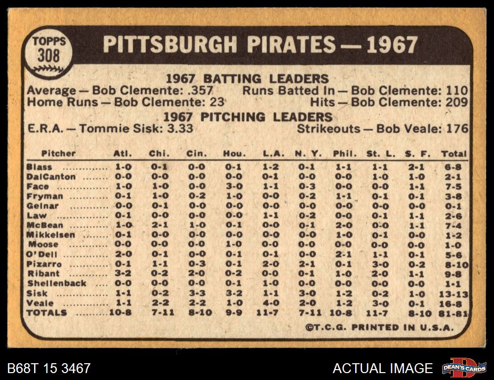 1968 Topps #308 Pirates Team