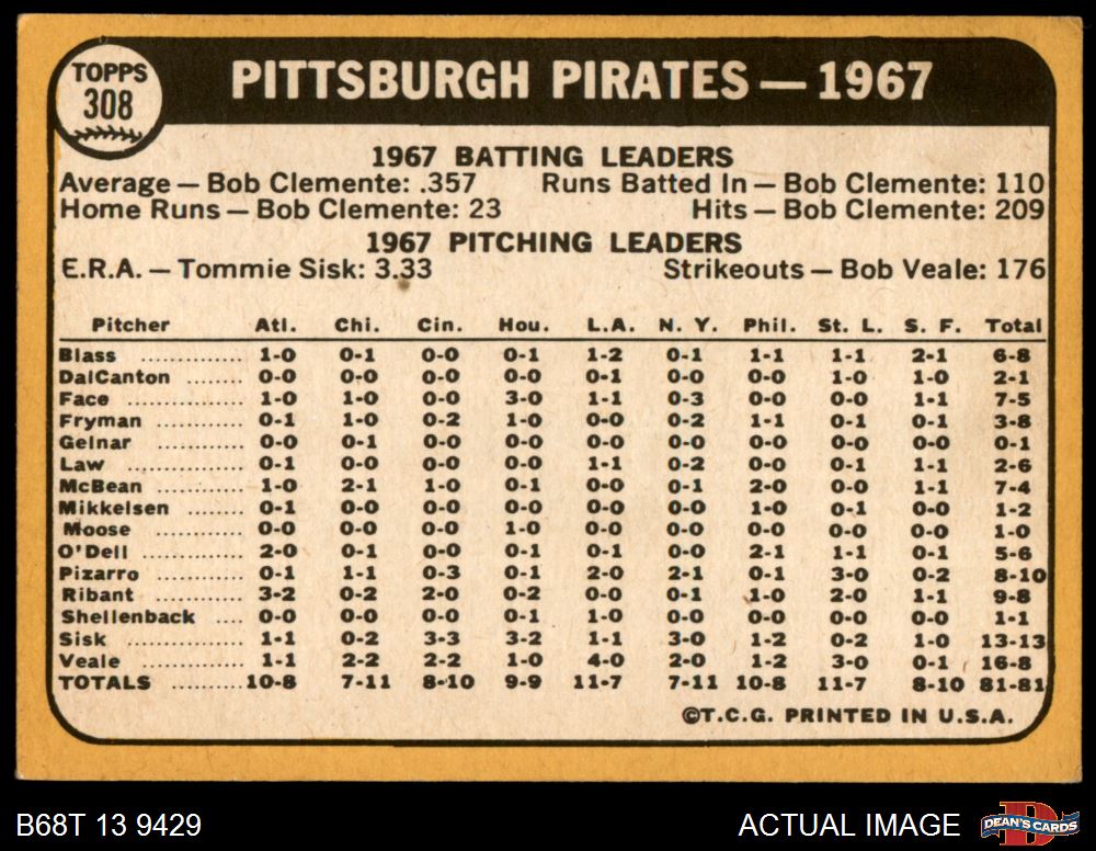 1968 Topps #308 Pirates Team 7 - NM