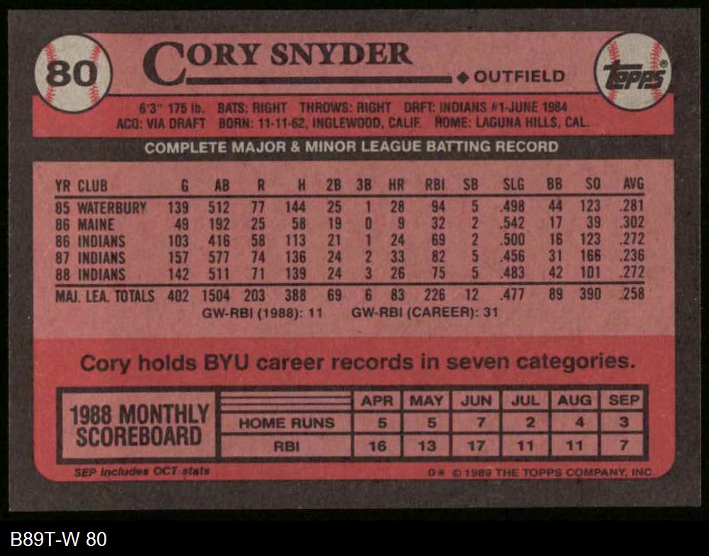 1989 Topps #80 Cory Snyder 8 - NM/MT