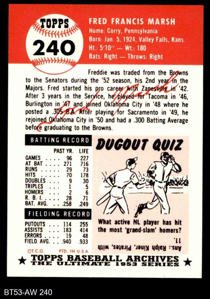 1953 Topps Archives #240 Fred Marsh 8 - NM/MT