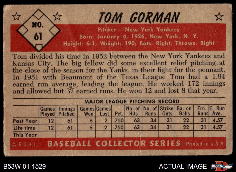1953 Bowman B&W #61 Tom Gorman 2 - GOOD