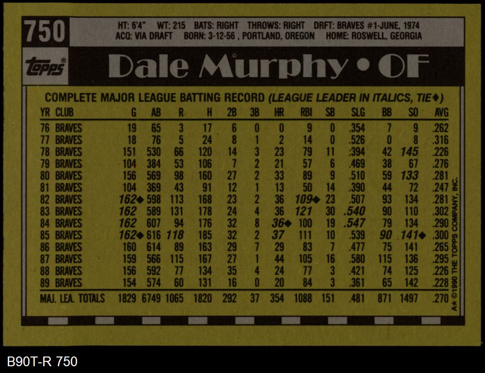1990 Topps #750 Dale Murphy 8 - NM/MT