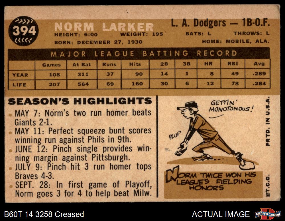 1960 Topps #394 Norm Larker 2 - GOOD