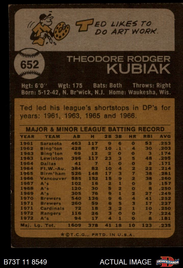 1973 Topps #652 Ted Kubiak 3 - VG