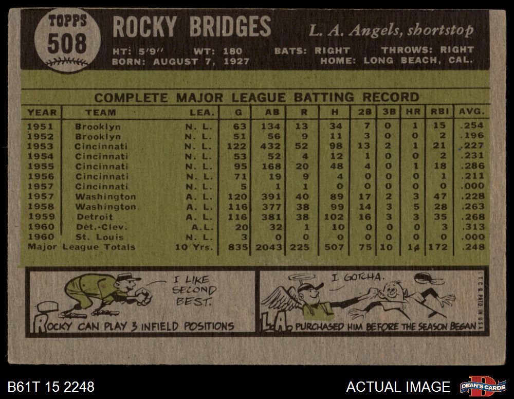 1961 Topps #508 Rocky Bridges 2 - GOOD