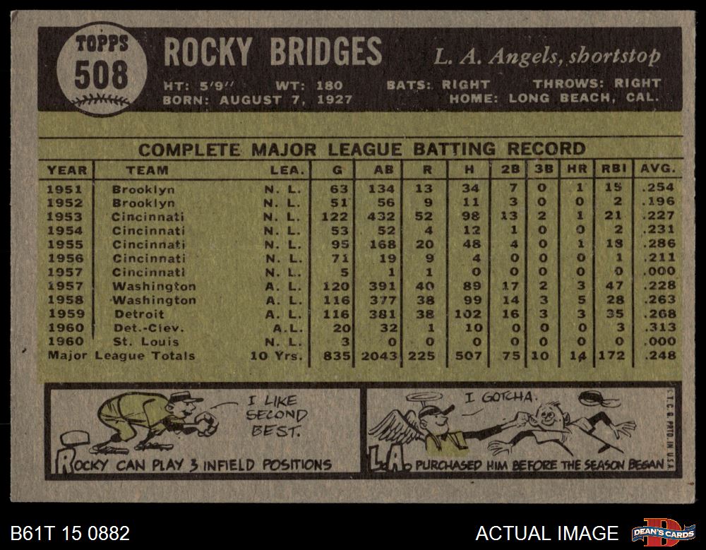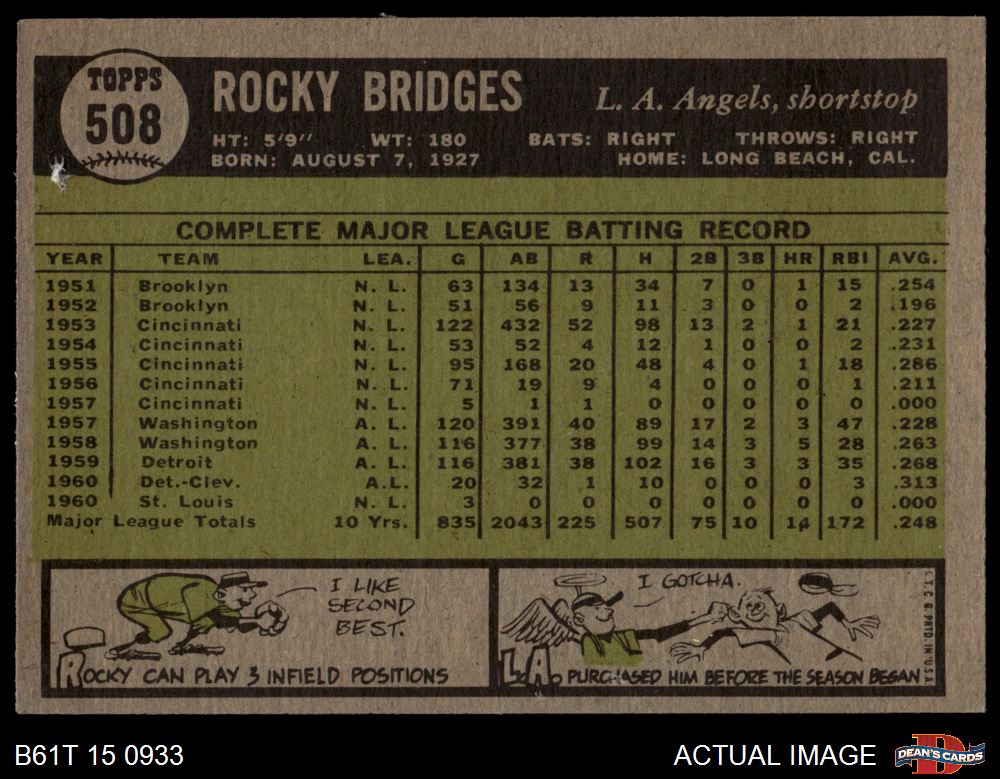 1961 Topps #508 Rocky Bridges 4 - VG/EX
