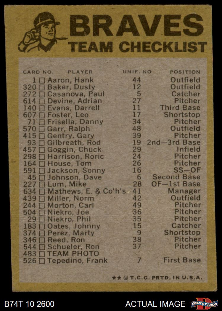 1974 Topps Baseball Cards (18,001 available)1974 Topps Red Team Checklist Braves (44 available)
