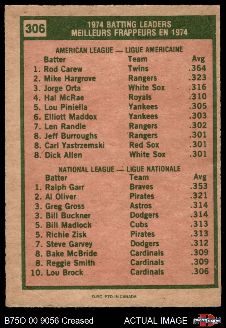 1975 O-Pee-Chee #306 - Rod Carew / Ralph Garr Batting Leaders 3 - VG