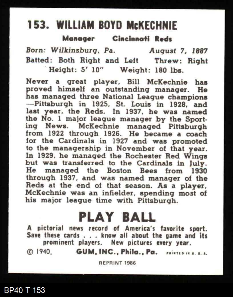 1940 Play Ball Reprint #153 Bill McKechnie 8 - NM/MT
