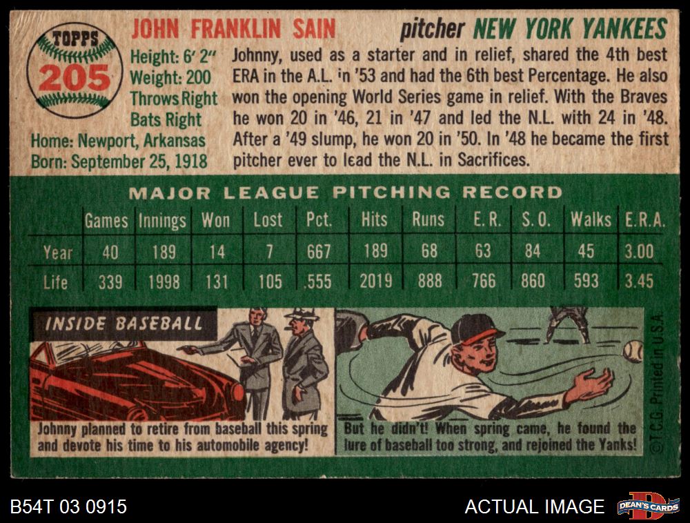 1954 Topps #205 Johnny Sain 4 - VG/EX