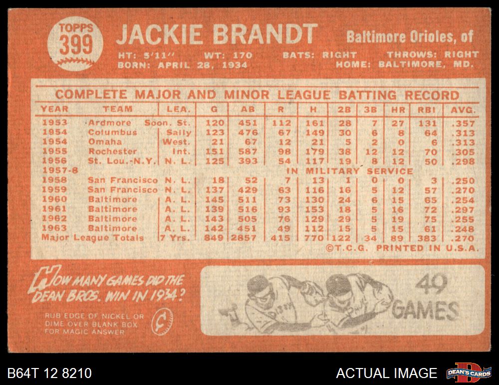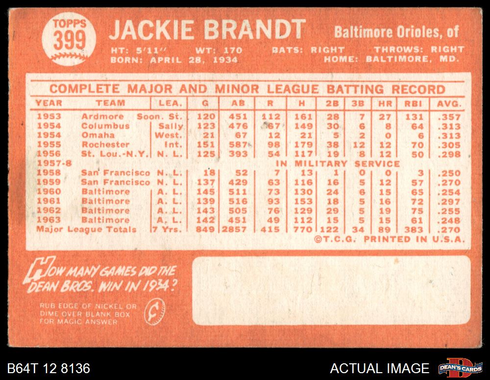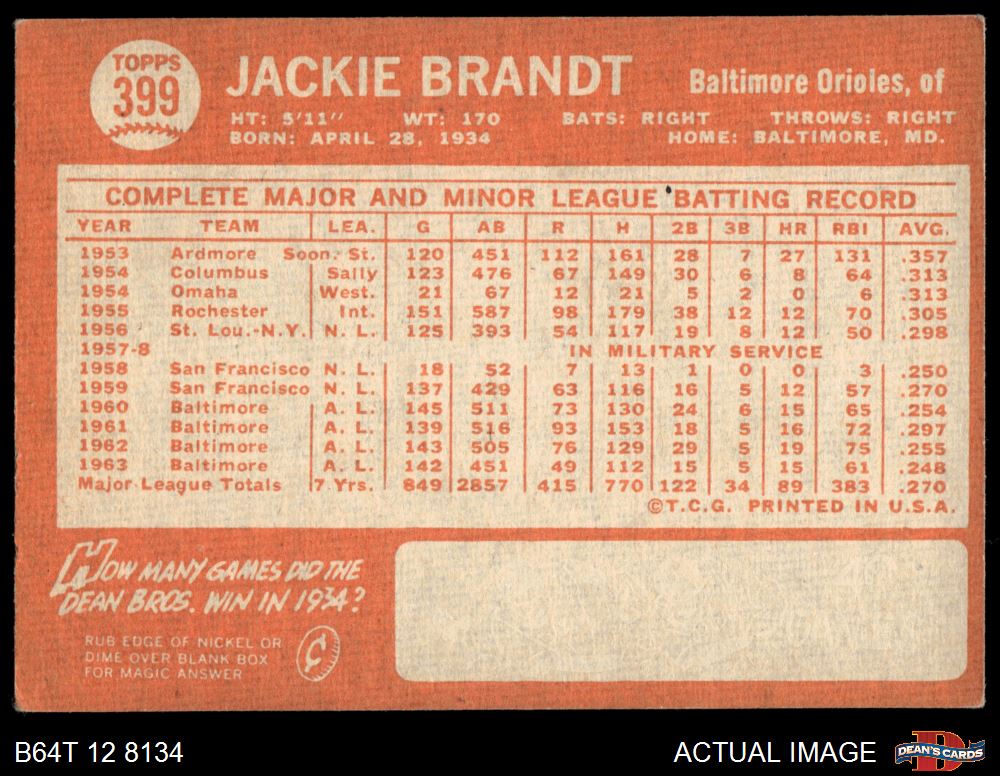 1964 Topps #399 Jackie Brandt 3 - VG