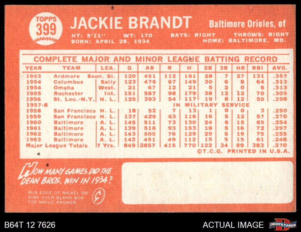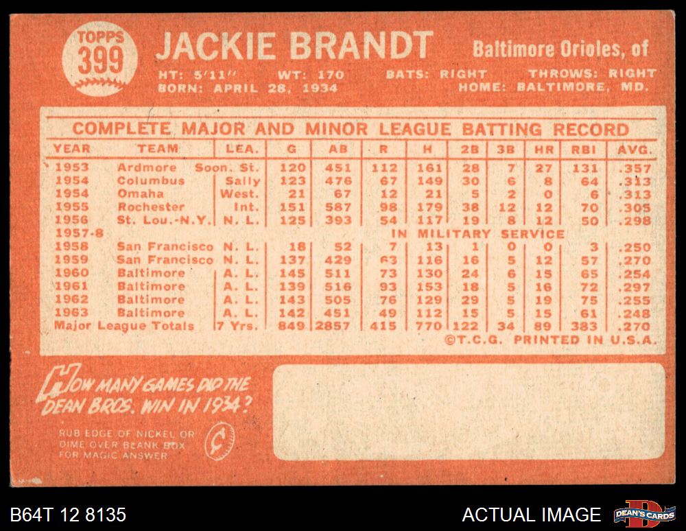 1964 Topps #399 Jackie Brandt 4 - VG/EX