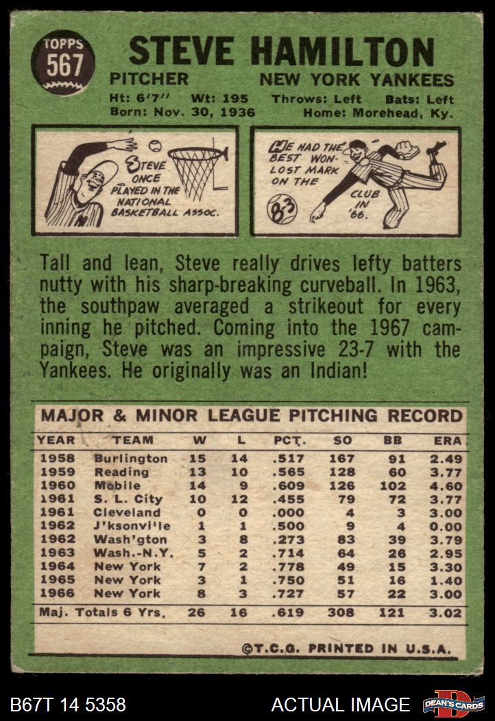1967 Topps #567 Steve Hamilton 4 - VG/EX
