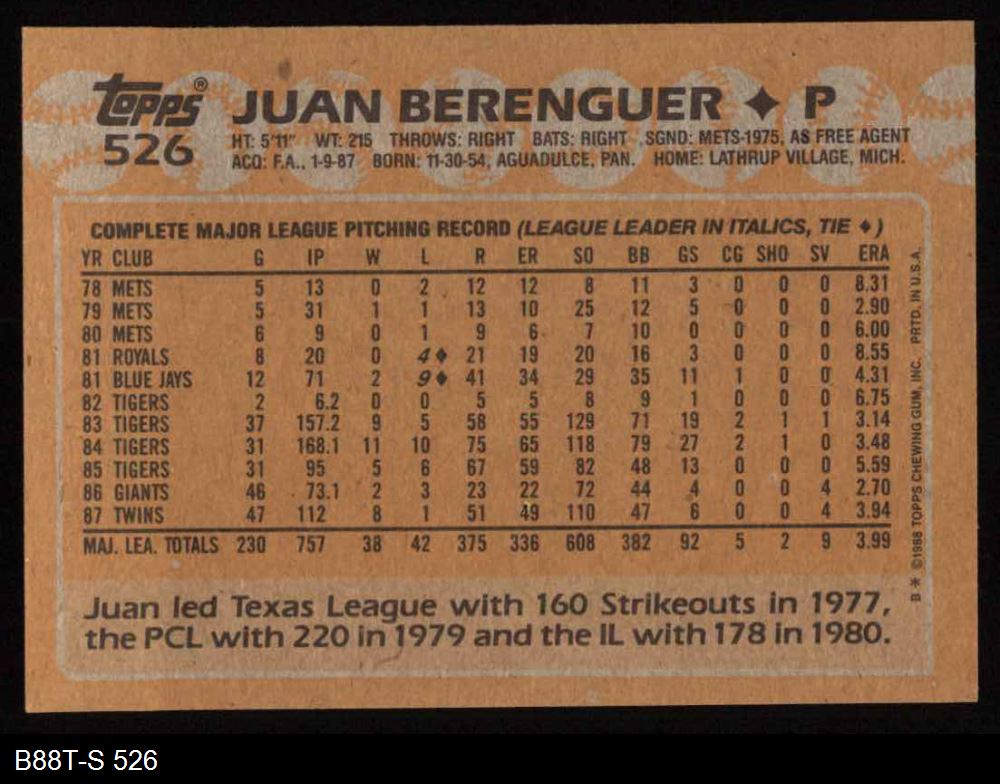 1988 Topps #526 Juan Berenguer 8 - NM/MT