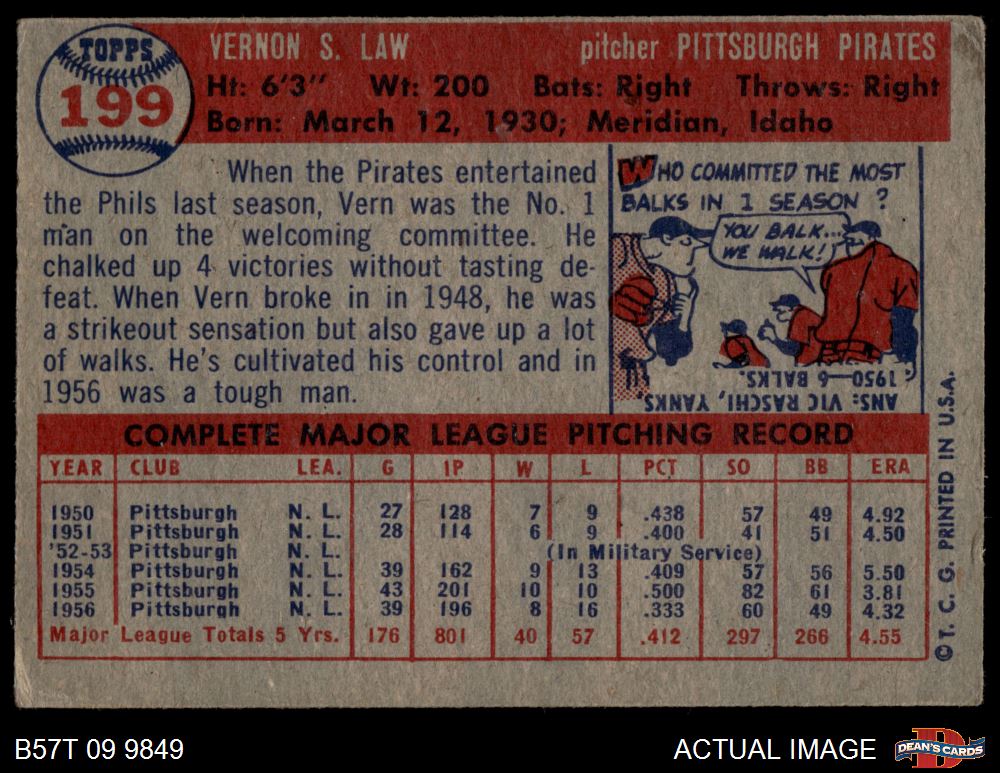 1957 Topps #199 Vern Law 2 - GOOD