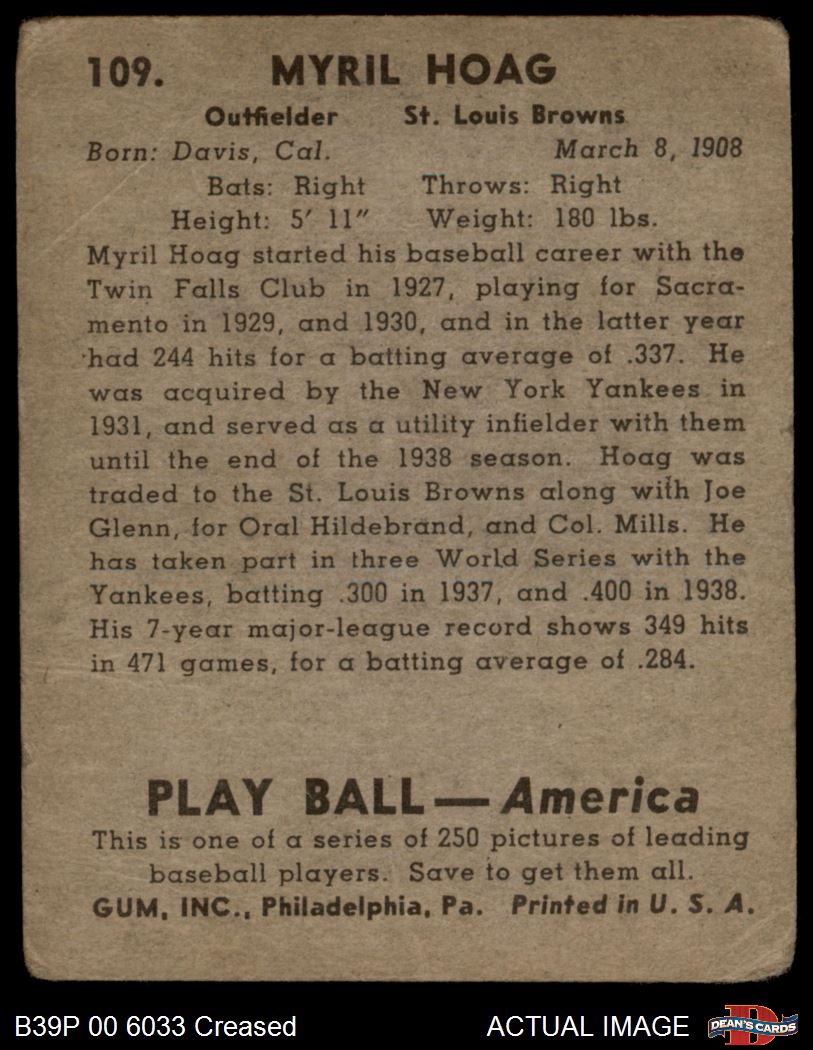 1939 Play Ball #109 Myril Hoag 1.5 - FAIR