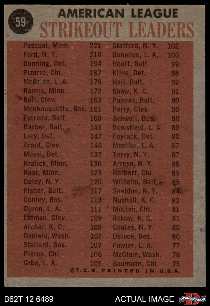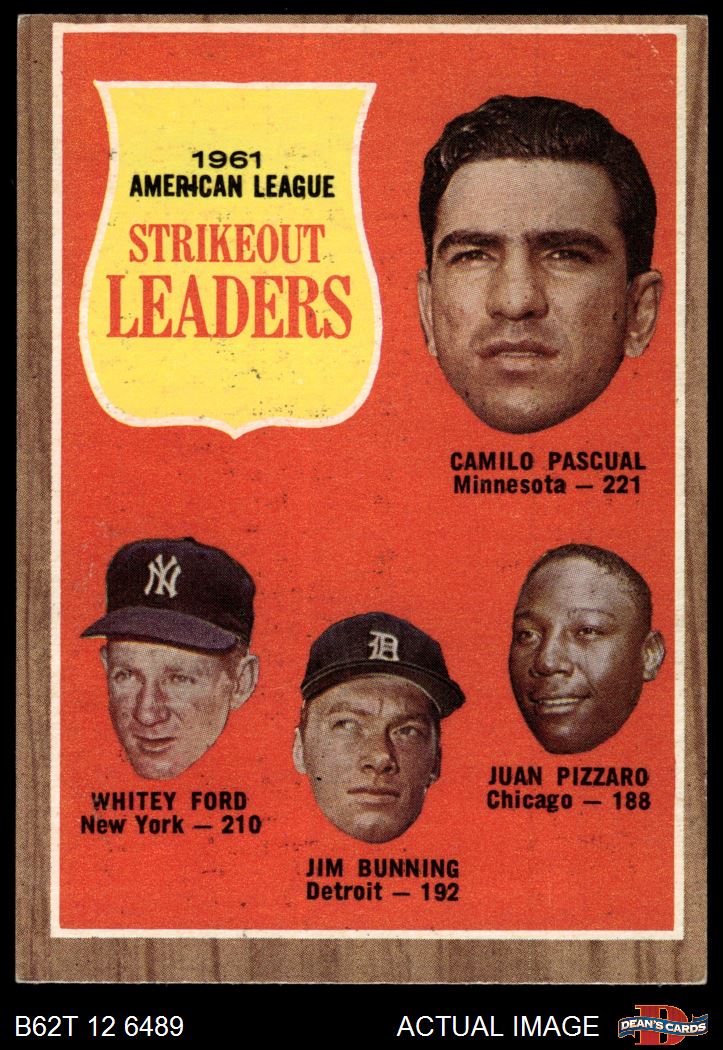 1962 Topps #59 - Whitey Ford / Jim Bunning / Camilo Pascual / Juan Pizarro AL Strikeout Leaders 2 - GOOD