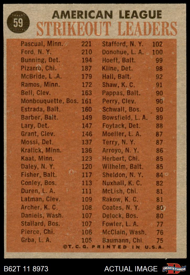 1962 Topps #59 - Whitey Ford / Jim Bunning / Camilo Pascual / Juan Pizarro AL Strikeout Leaders 6 - EX/MT