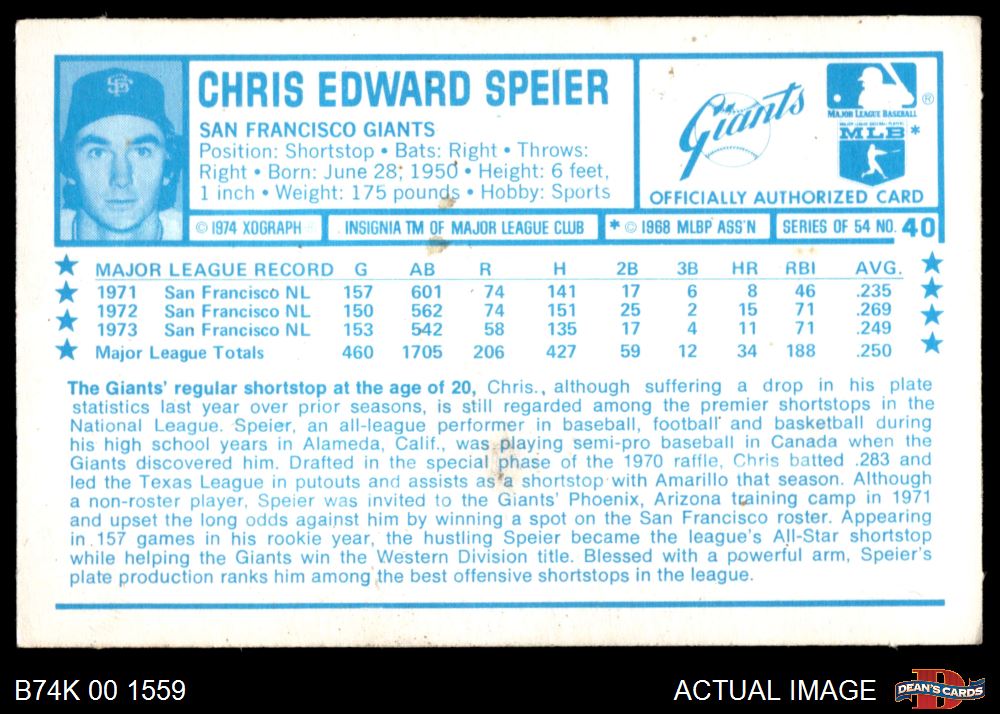 1974 Kellogg's #40 Chris Speier 2 - GOOD