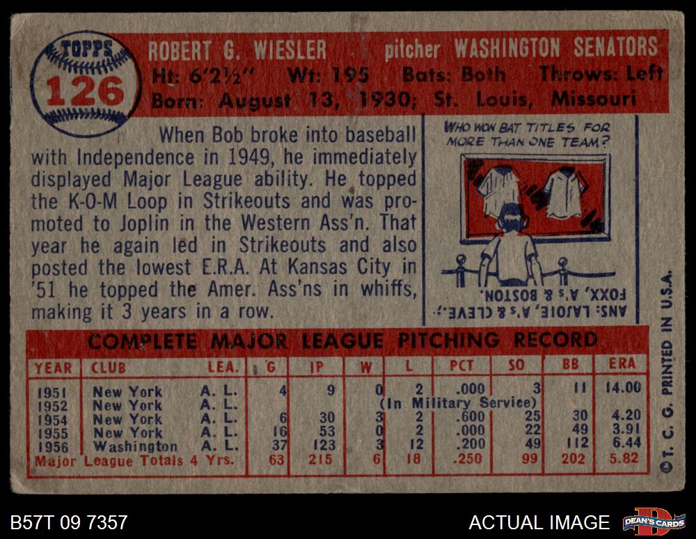 1957 Topps #126 Bob Wiesler 2 - GOOD