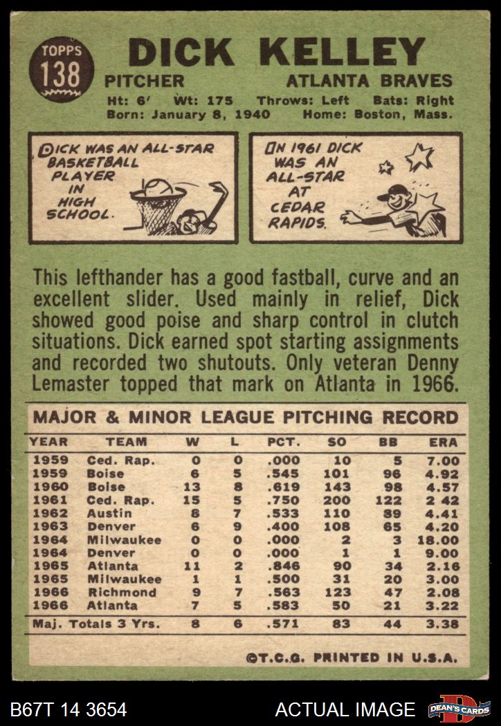 1967 Topps #138 Dick Kelley 3 - VG