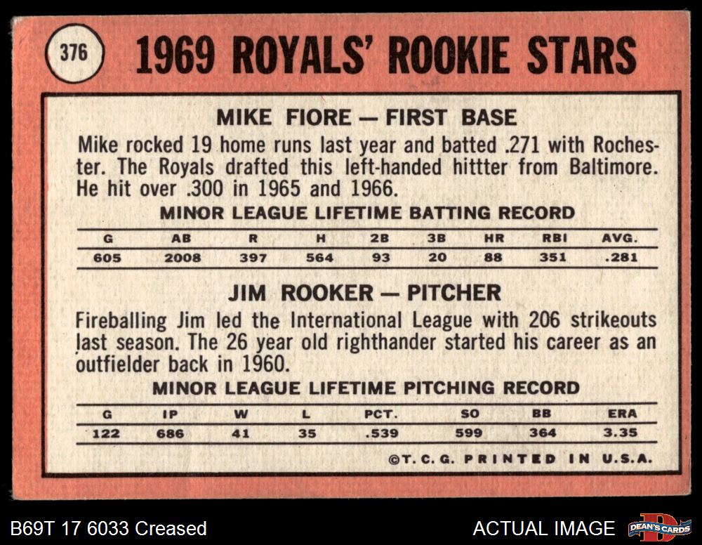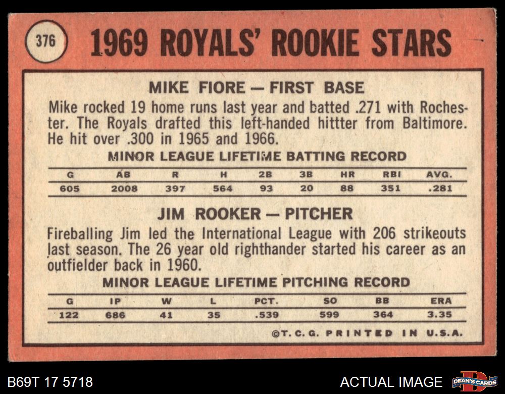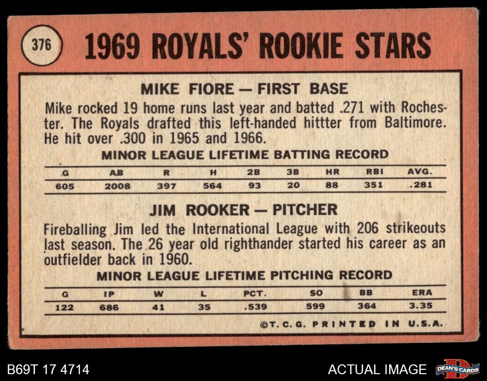 1969 Topps #376 - Mike Fiore / Jim Rooker Royals Rookies 2 - GOOD