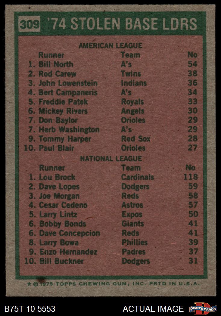 1975 Topps #309 - Lou Brock / Bill North SB Leaders 3.5 - VG+