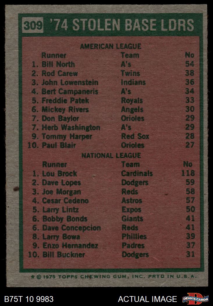 1975 Topps #309 - Lou Brock / Bill North SB Leaders 6 - EX/MT