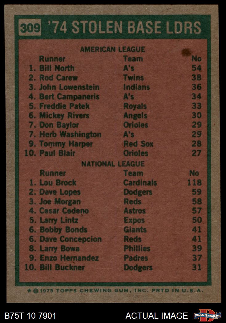 1975 Topps #309 - Lou Brock / Bill North SB Leaders 8 - NM/MT
