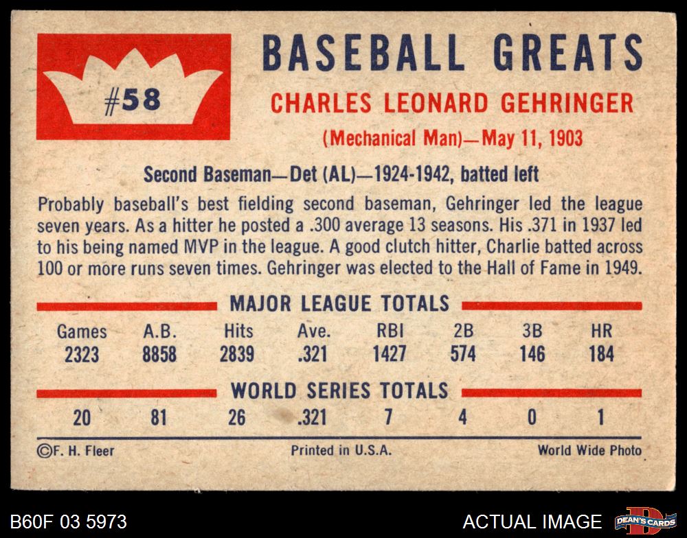 1960 Fleer #58 Charlie Gehringer 3 - VG