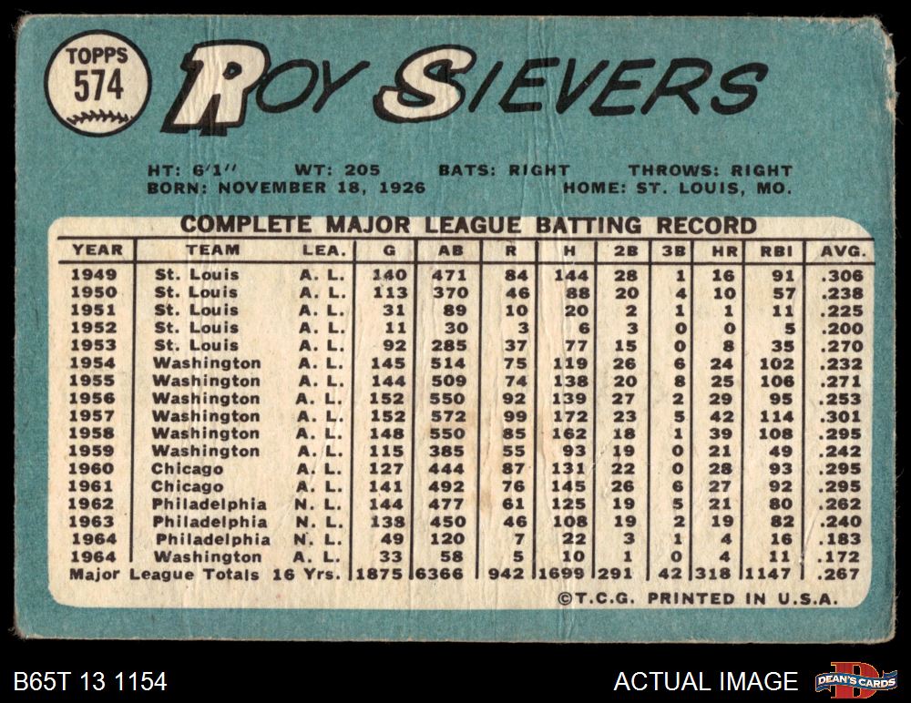 1965 Topps #574 Roy Sievers AUTHENTIC