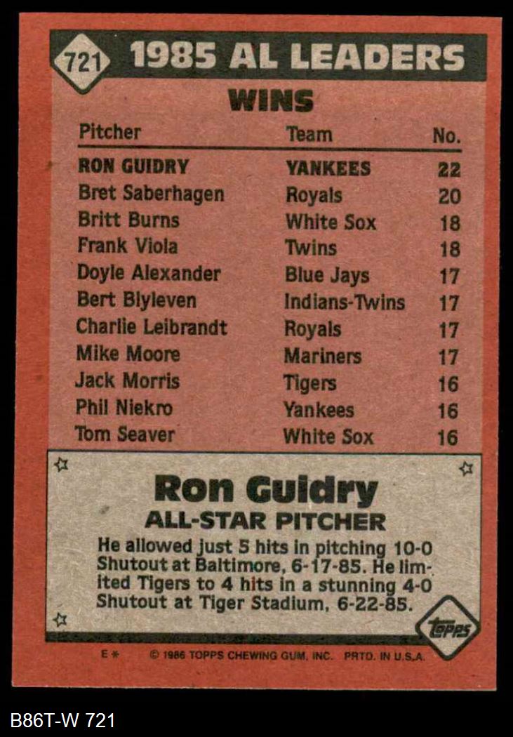 1986 Topps #721 - Ron Guidry All-Star 8 - NM/MT