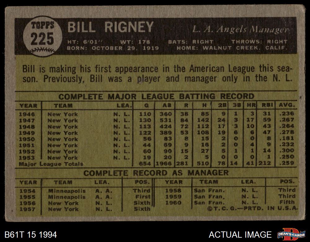 1961 Topps #225 Bill Rigney Front Thumbnail