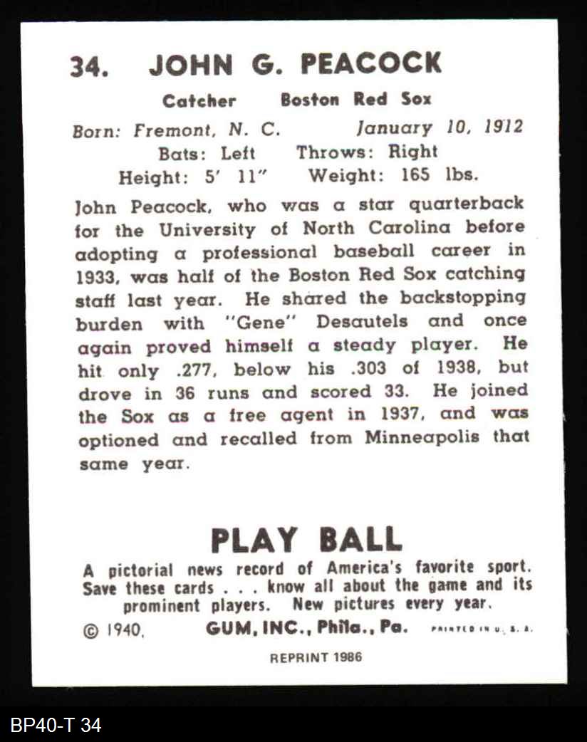 1940 Play Ball Reprint #34 Johnny Peacock 8 - NM/MT