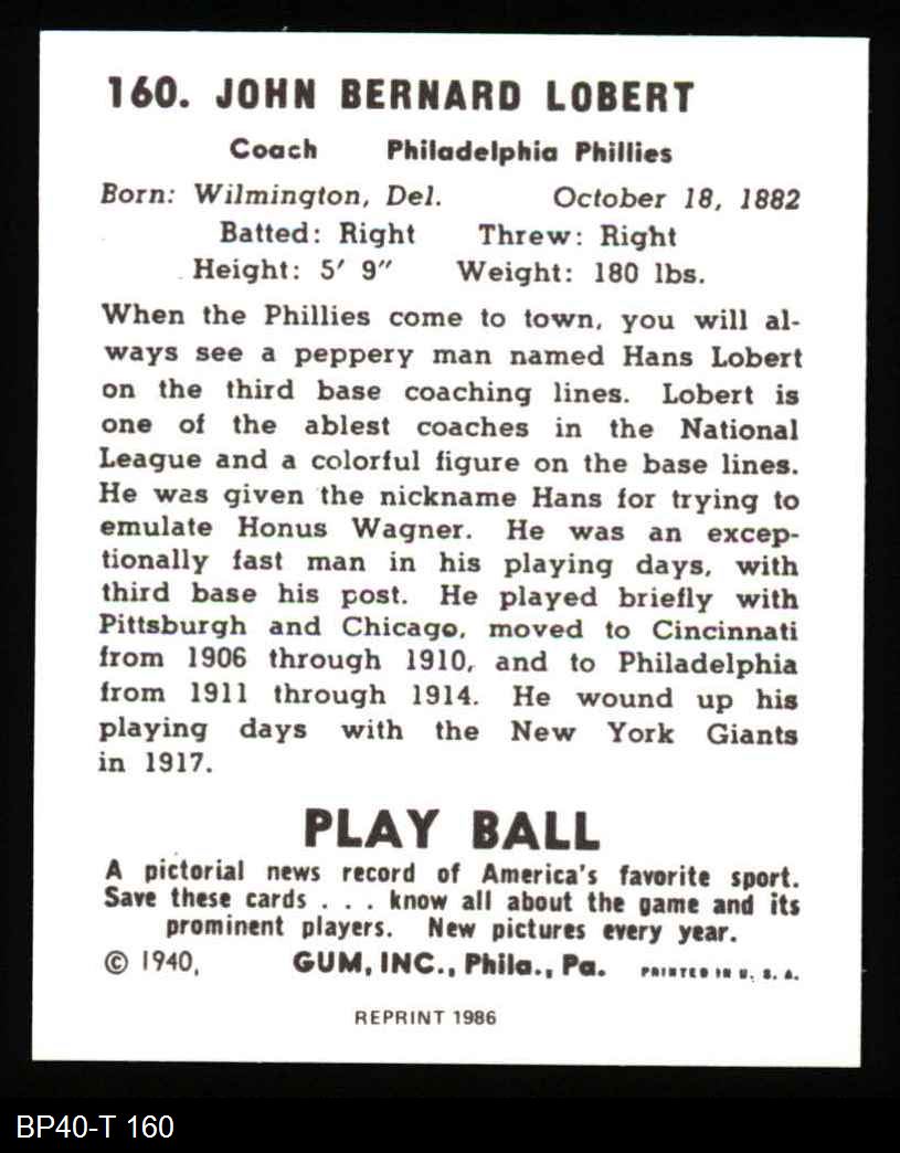 1940 Play Ball Reprint #160 Hans Lobert 8 - NM/MT