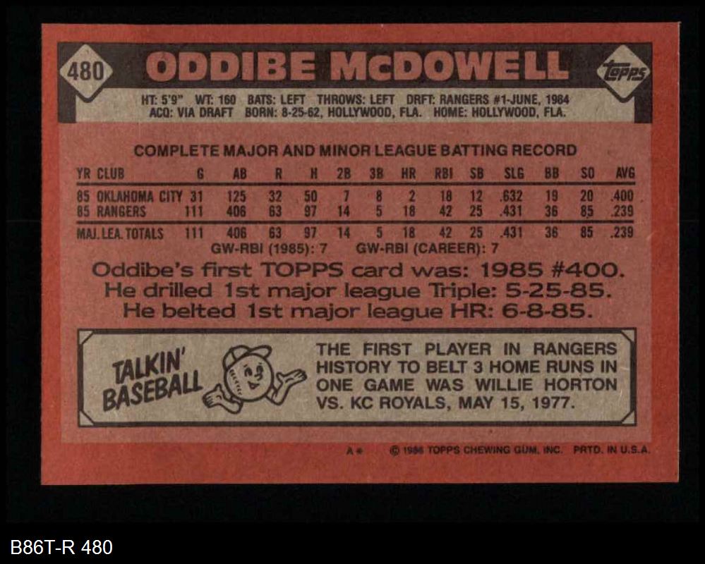 1986 Topps #480 Oddibe McDowell