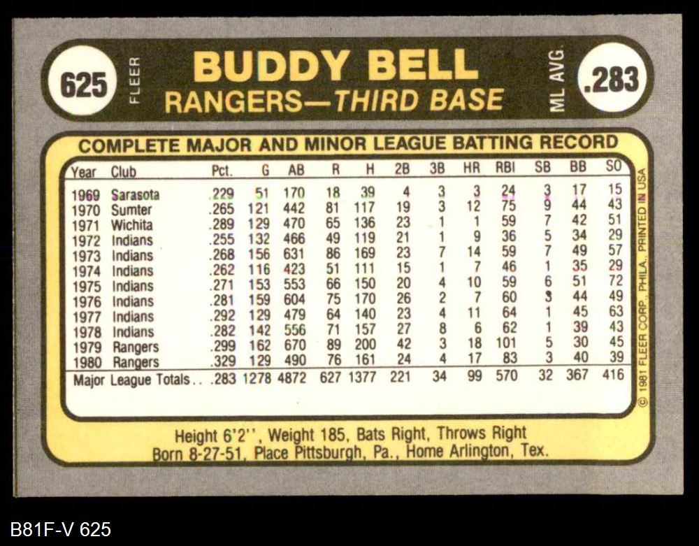 1981 Fleer #625 Buddy Bell 8 - NM/MT