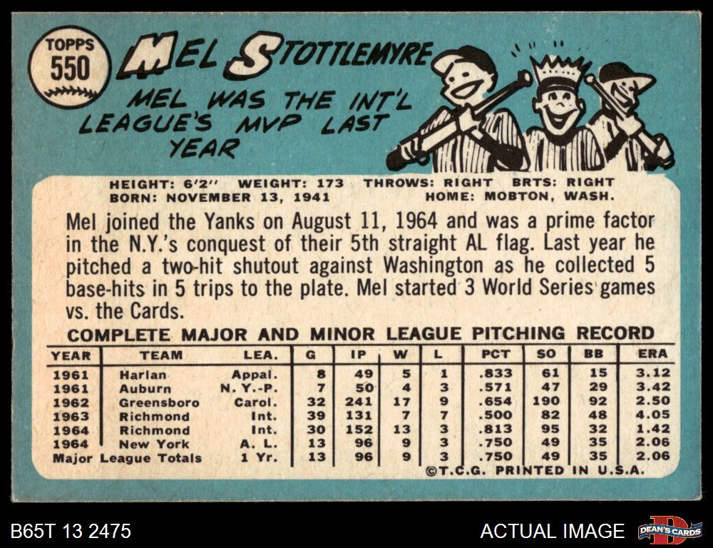 1965 Topps #550 Mel Stottlemyre 5 - EX