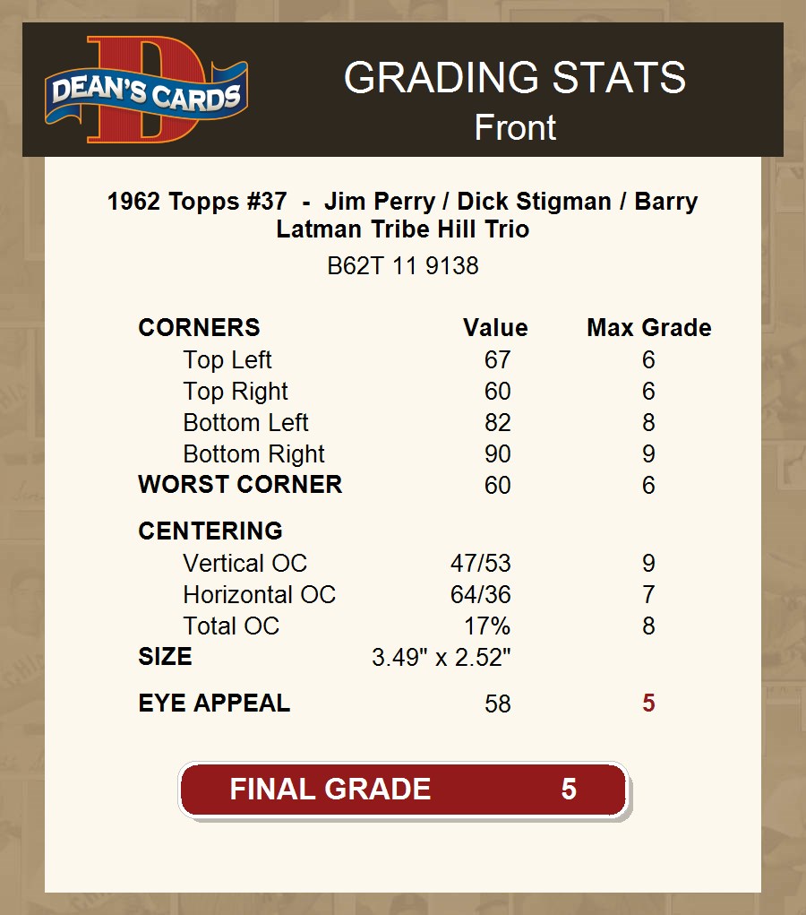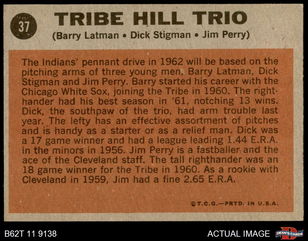 1962 Topps #37 - Jim Perry / Dick Stigman / Barry Latman Tribe Hill Trio 5 - EX