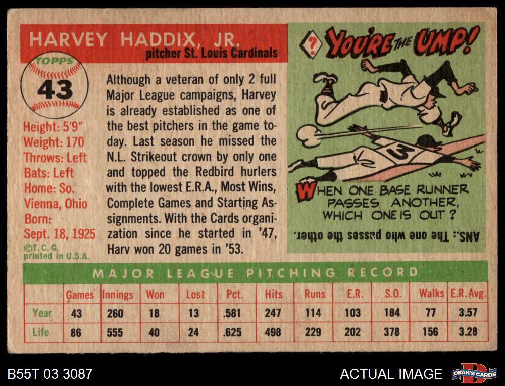 1955 Topps #43 Harvey Haddix 2 - GOOD